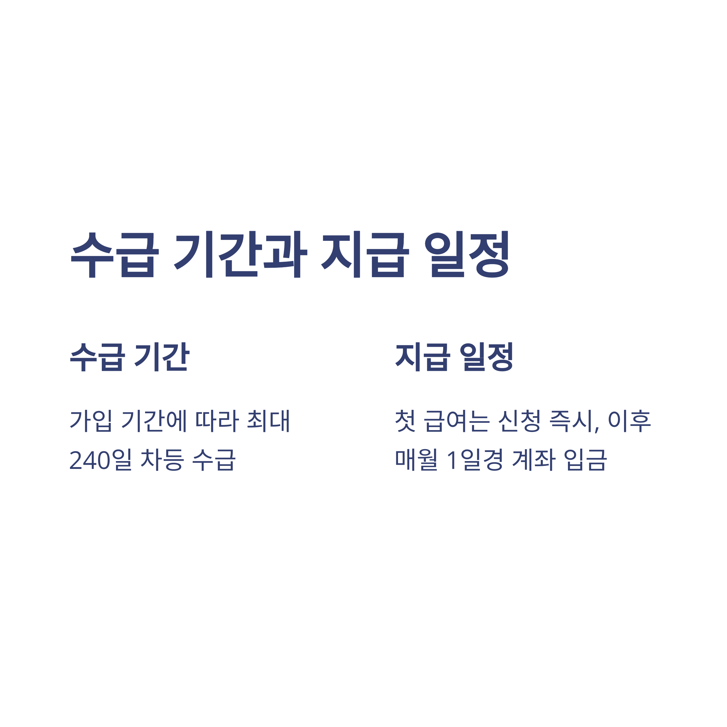 수급 기간은 실직 전 가입 기간에 따라 최장 240일까지 차등 적용됩니다. 저는 6개월 가입자로 최대 90일(3개월) 수급 대상이었는데, 신청 즉시 첫 급여를 받고 이후 매월 1일 경 지정 계좌로 입금받았습니다. 지급 일정은 고용보험 누리집 ‘지급일정 조회’에서 확인 가능합니다.