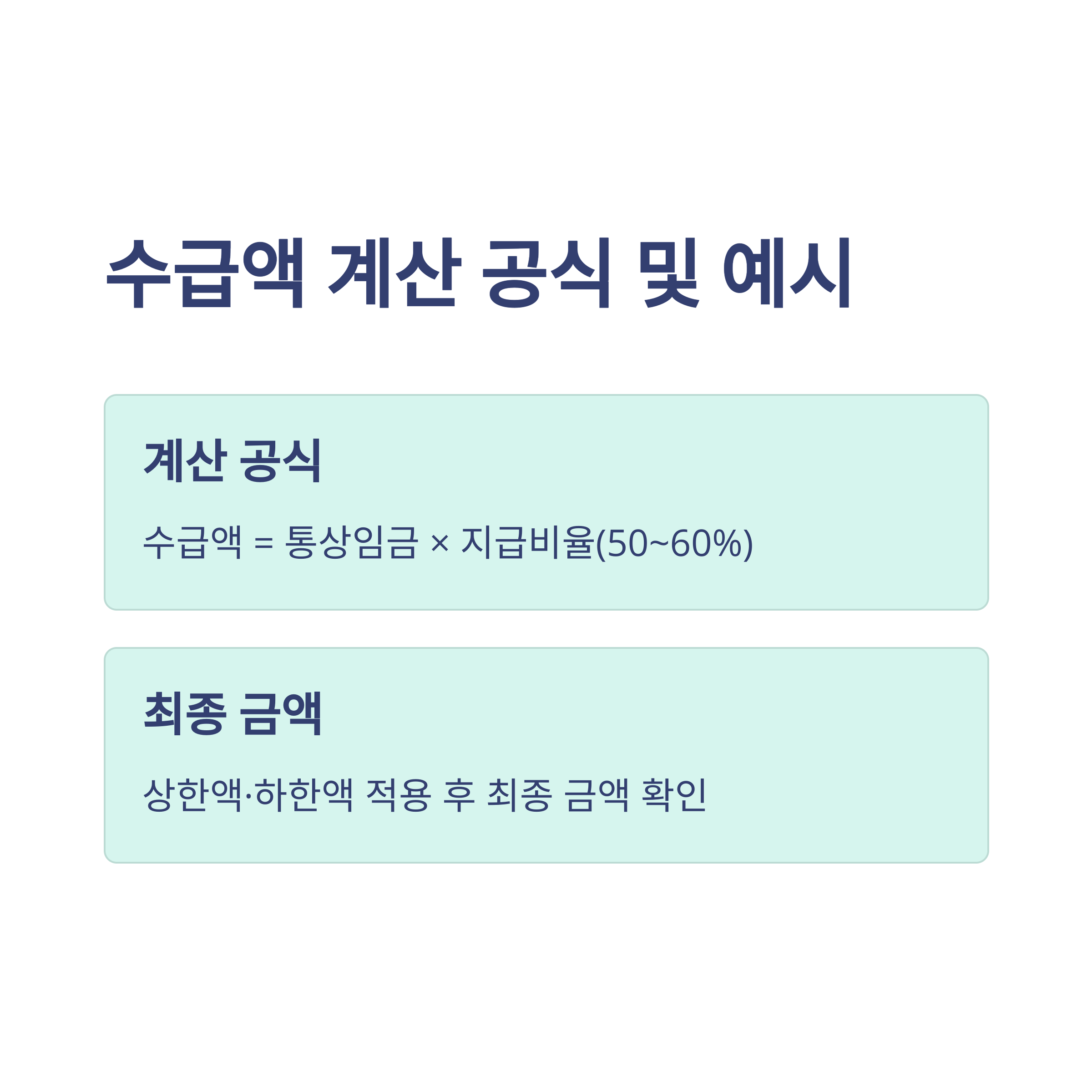실업급여 수급액은 ‘통상임금 × 지급비율(50~60%)’로 계산되며, 상한·하한액이 적용됩니다. 예를 들어 월 통상임금이 250만 원인 경우 250만×50% = 125만 원을 지급받는데, 실제로는 상한액 220만 원을 초과하지 않는 범위 내에서 수령합니다. 정확한 계산은 고용보험 계산기를 활용하세요.