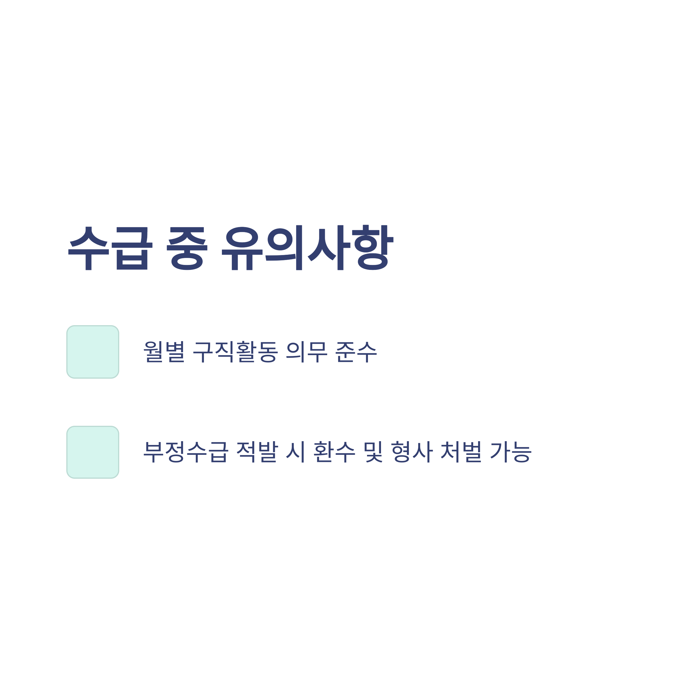 수급 중에는 구직활동 의무를 철저히 지켜야 하며, 부정수급 적발 시 환수 및 3년 이하 징역·3000만 원 이하 벌금이 부과될 수 있습니다. 저는 매월 실업인정 기간 전날 구직활동 증빙을 제출했고, 고용센터에서 요청하는 추가 자료도 즉시 대응했습니다. 자세한 유의사항은 고용노동부 고시를 확인하세요.