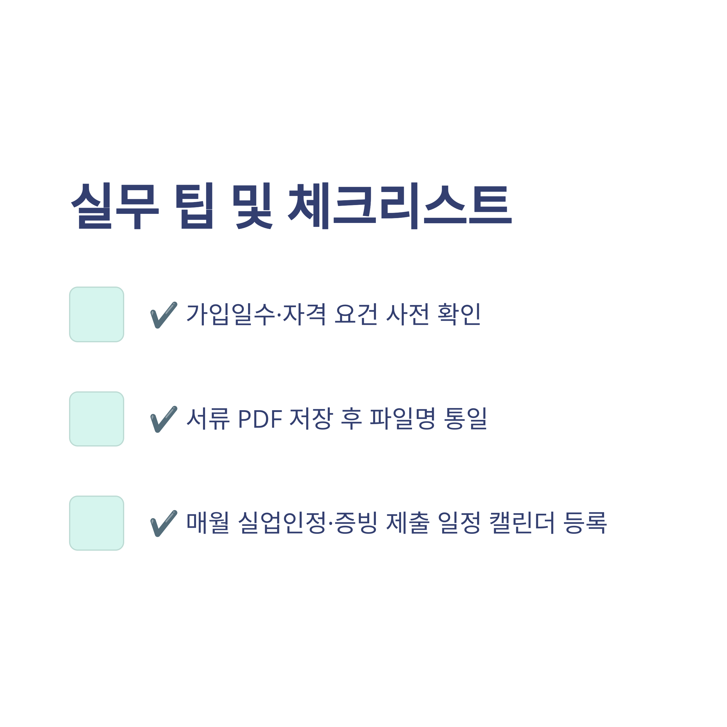 실업급여 신청과 수급 관리를 위해 제가 활용한 체크리스트를 공유합니다. 저는 매 단계 완료 시 ✔ 표시를 하고, 실업인정 전 주마다 체크리스트를 재검토해 급여 중단 위험을 방지했어요.