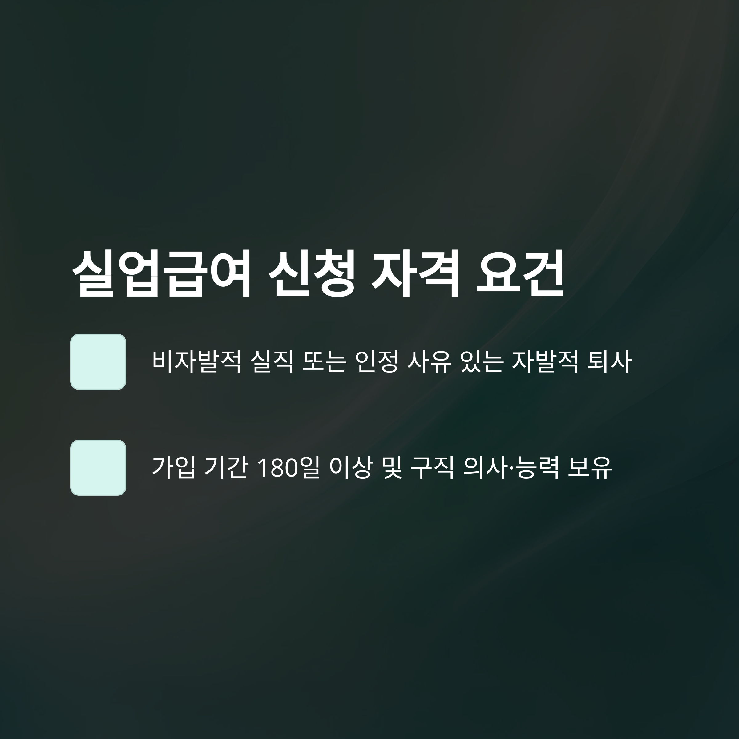 자격 요건은 비자발적 실직 또는 자발적 사유라도 특정 사유(건강·육아 등)에 한해 인정되며, 180일 이상 가입 외에도 당장 근로 의사와 능력이 있어야 합니다. 저는 퇴사 후 바로 구직활동 계획서를 작성해 제출했고, 이 점이 ‘능력·의사’ 기준 충족으로 인정받는 데 큰 도움이 되었어요. 기타 자격 기준 및 예외 사유는 고용보험 세부 기준에서 확인 가능합니다.
