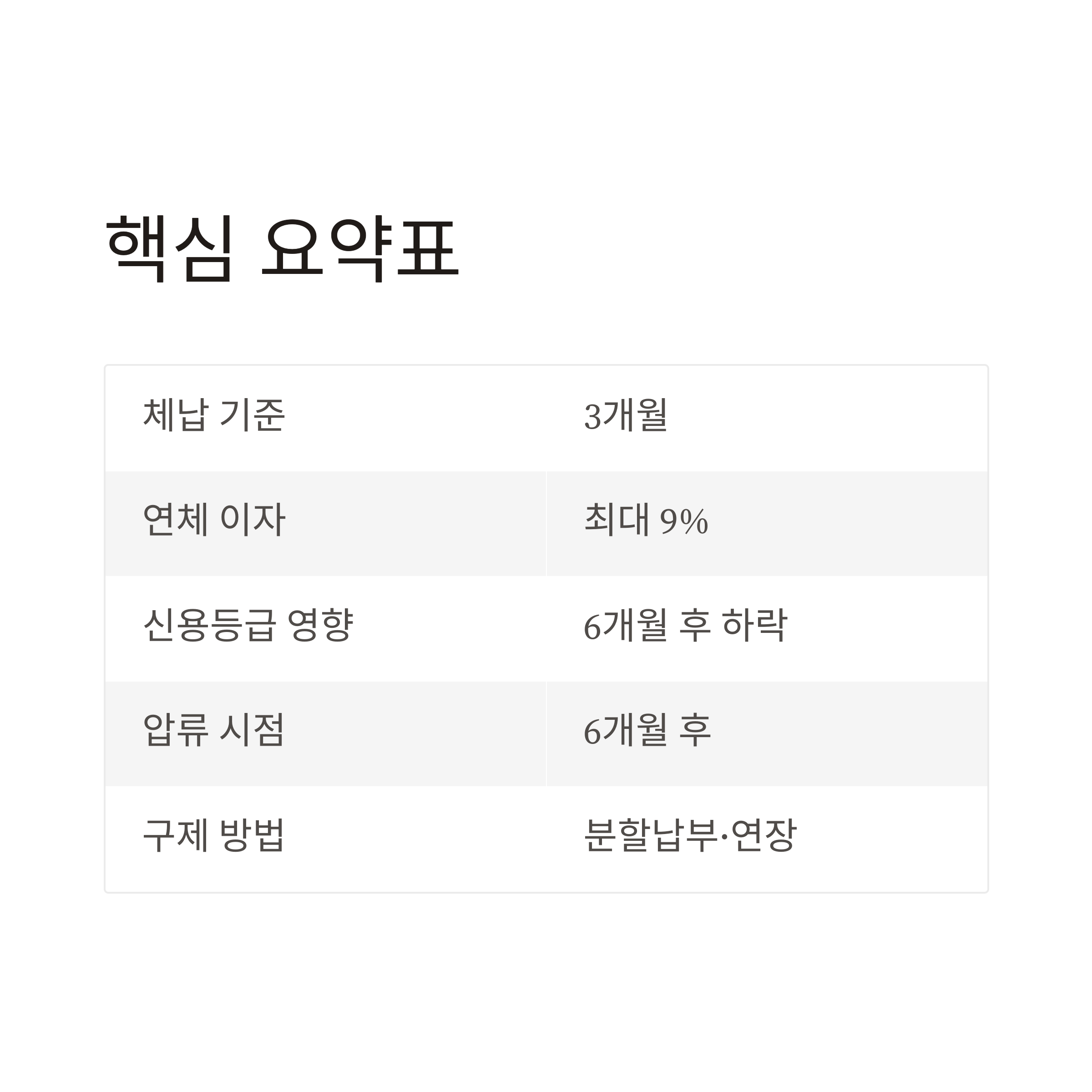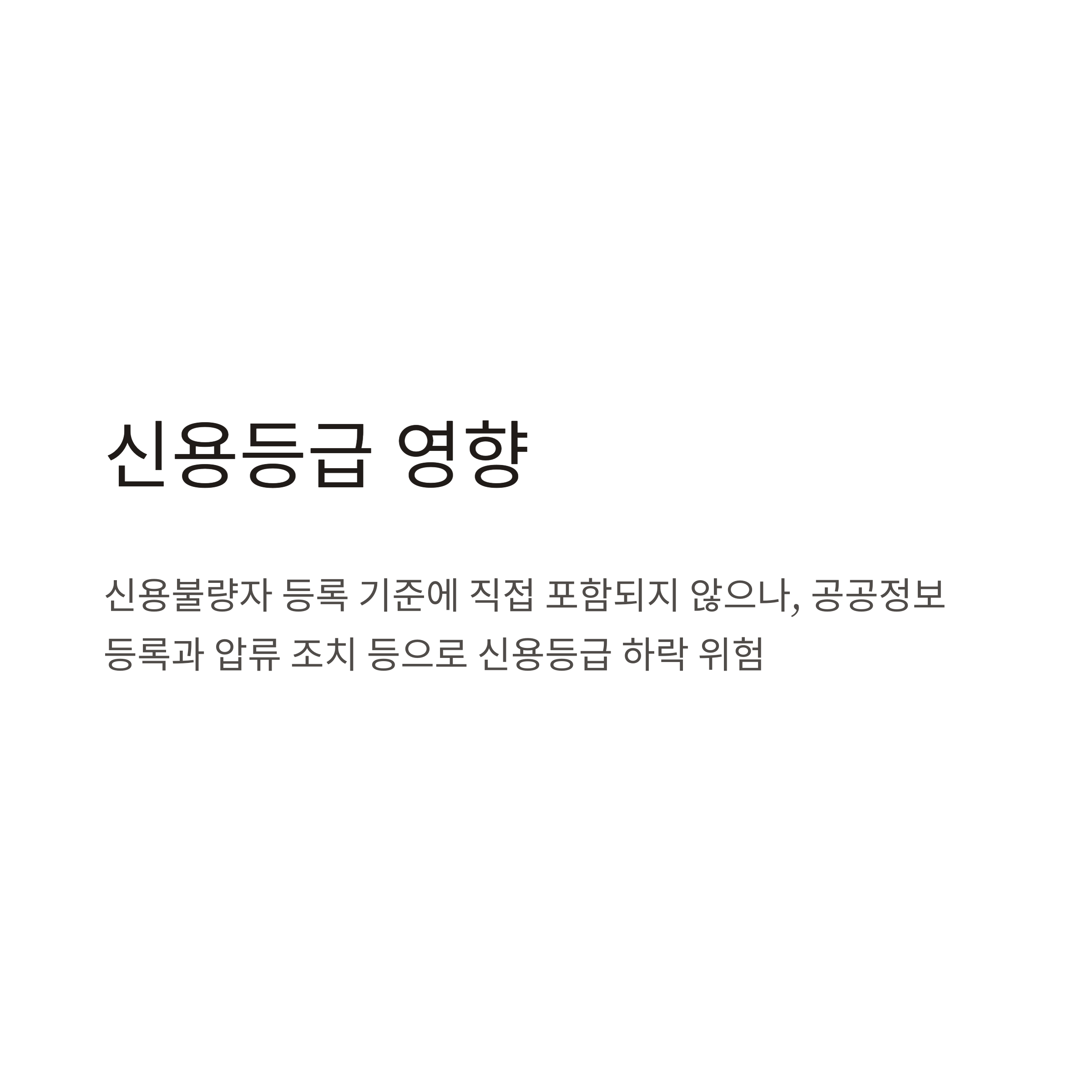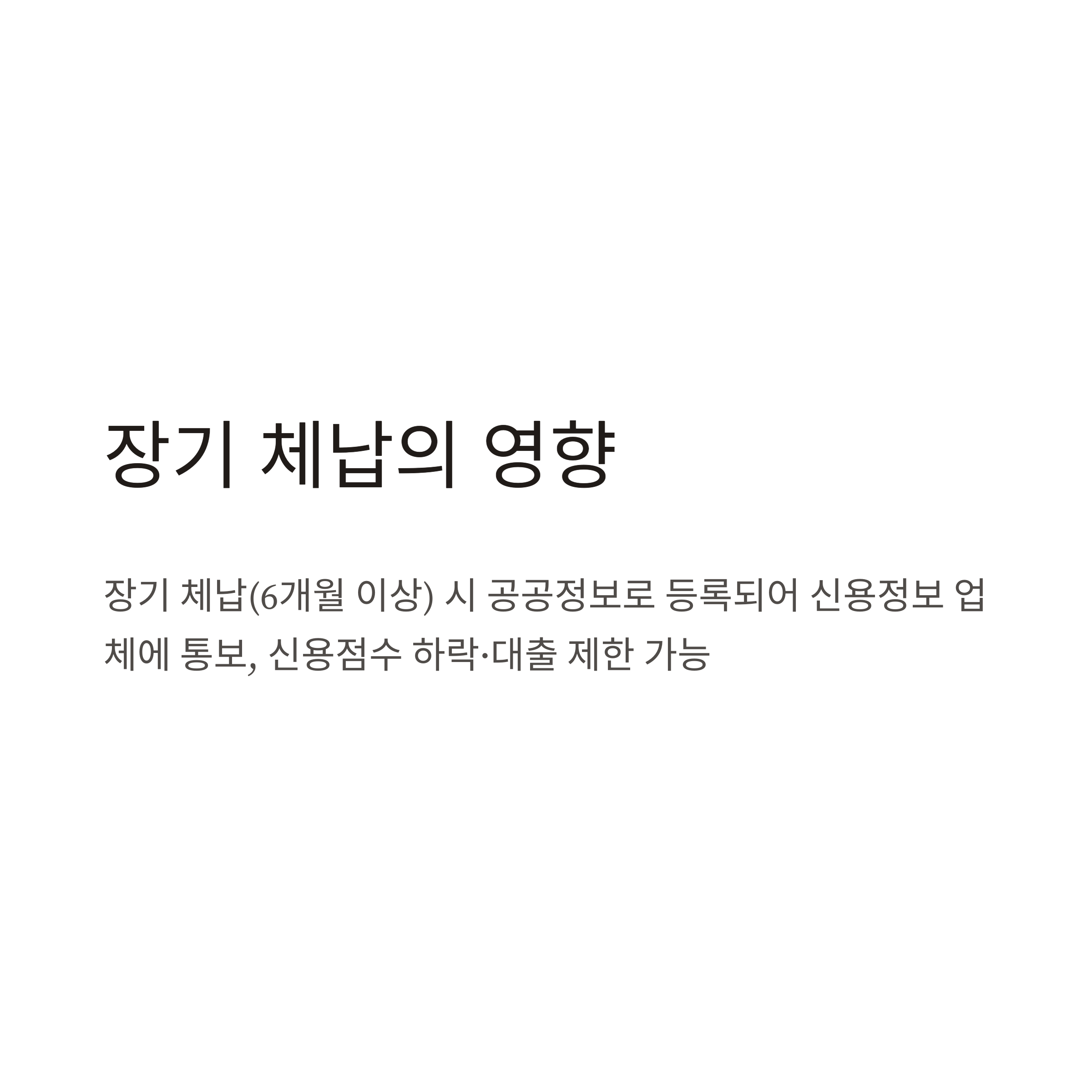 | 신용 영향 | 6개월 이상 미납 시 신용등급↓, 대출 제한 가능 |