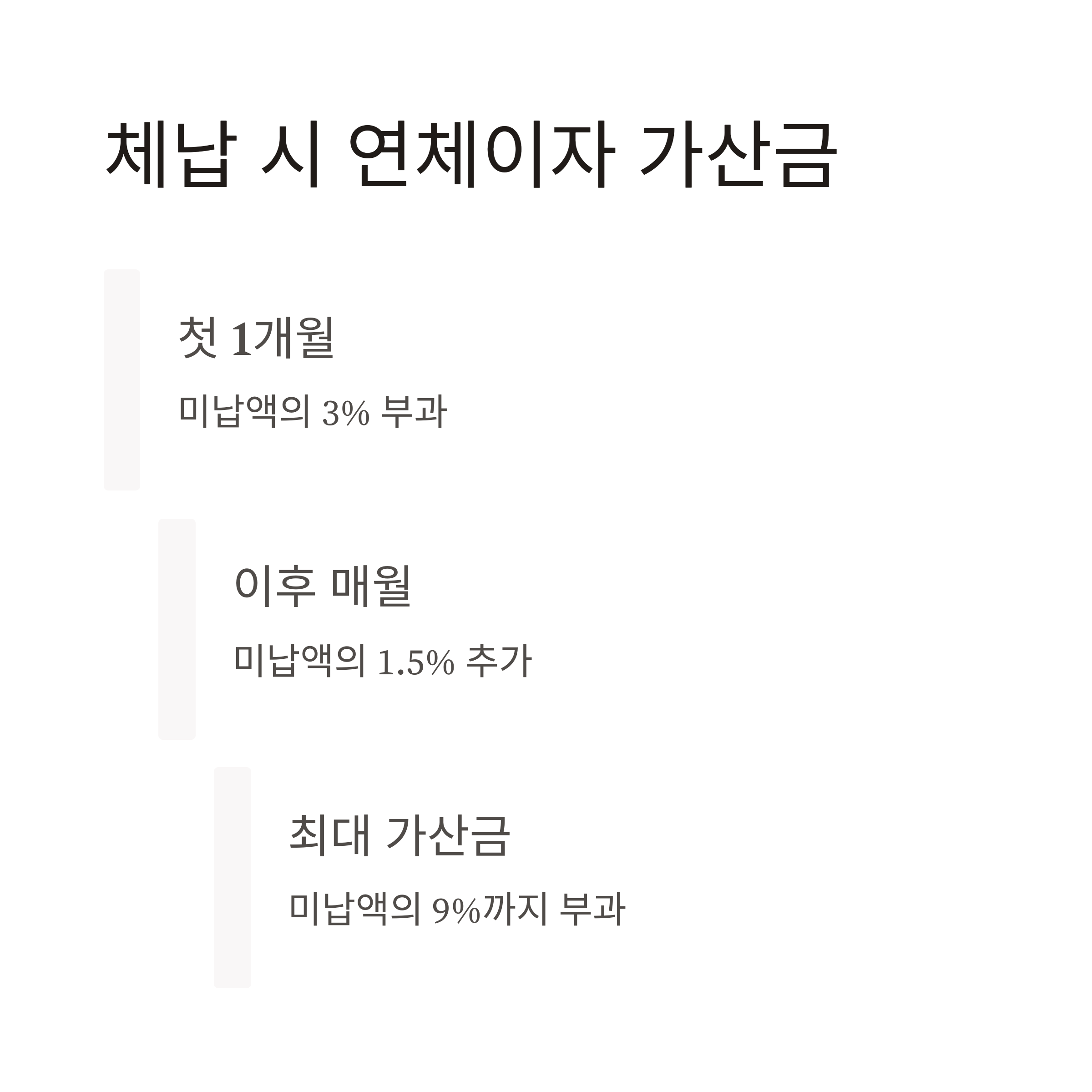 - 이후 매 1개월 지날 때마다: 납부금의 1.5% 추가 가산