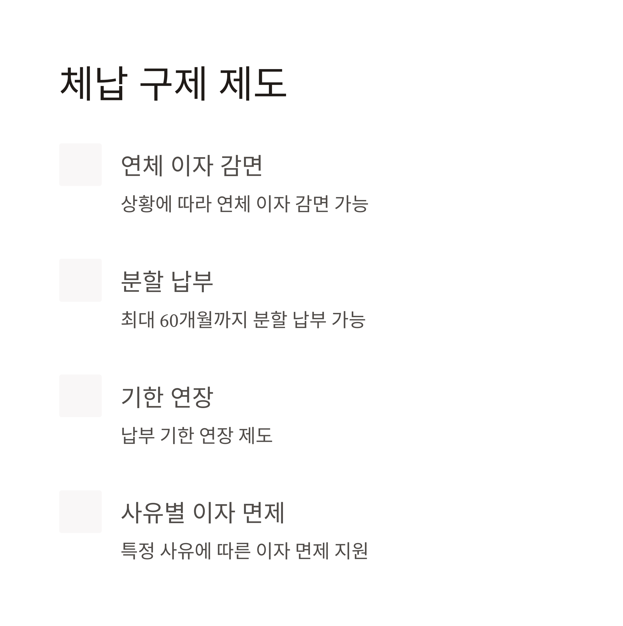 | 미납 해결 | 분할 납부·납부유예·연장 가능 |