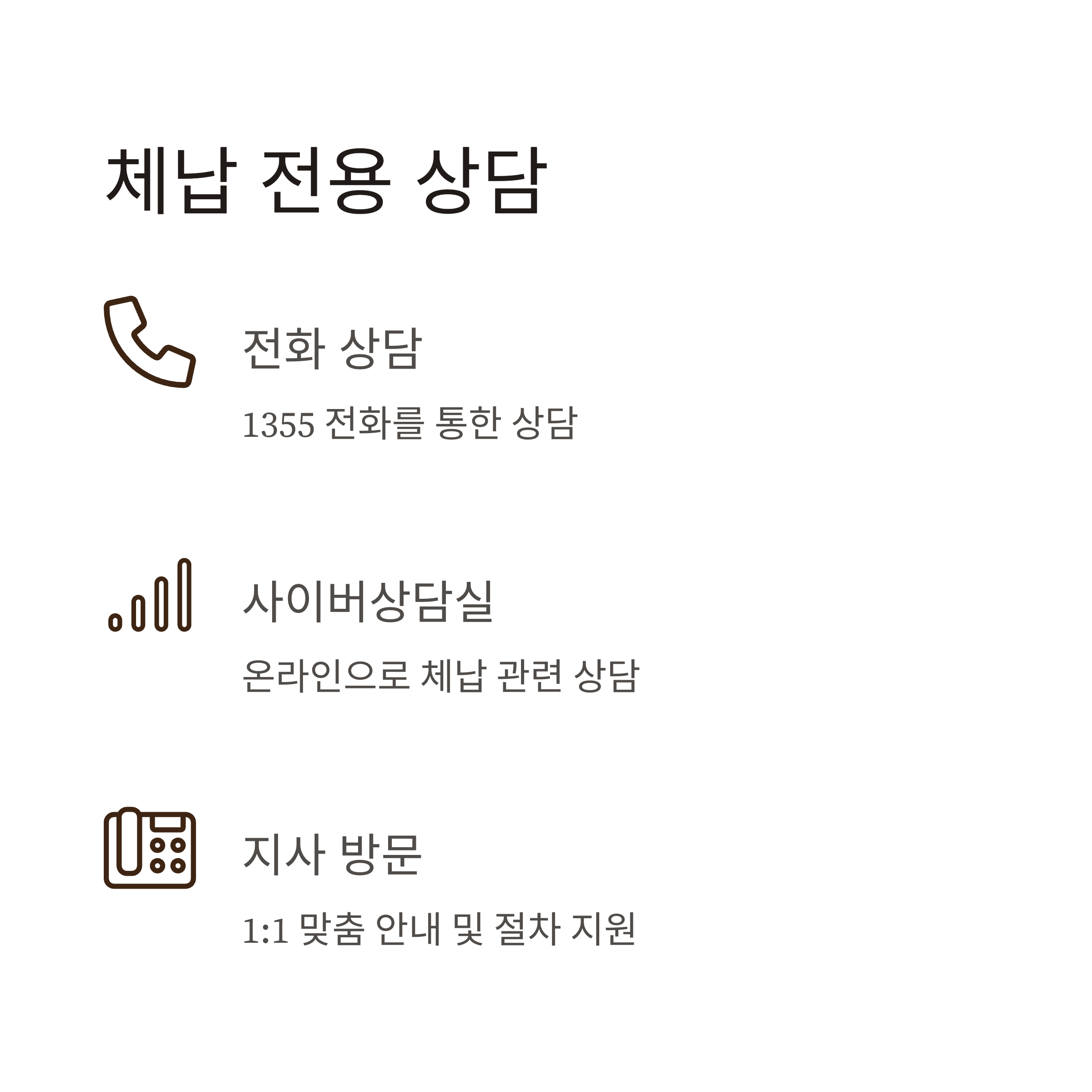 - 전화 상담: 1355 → 체납 전담 부서 연결