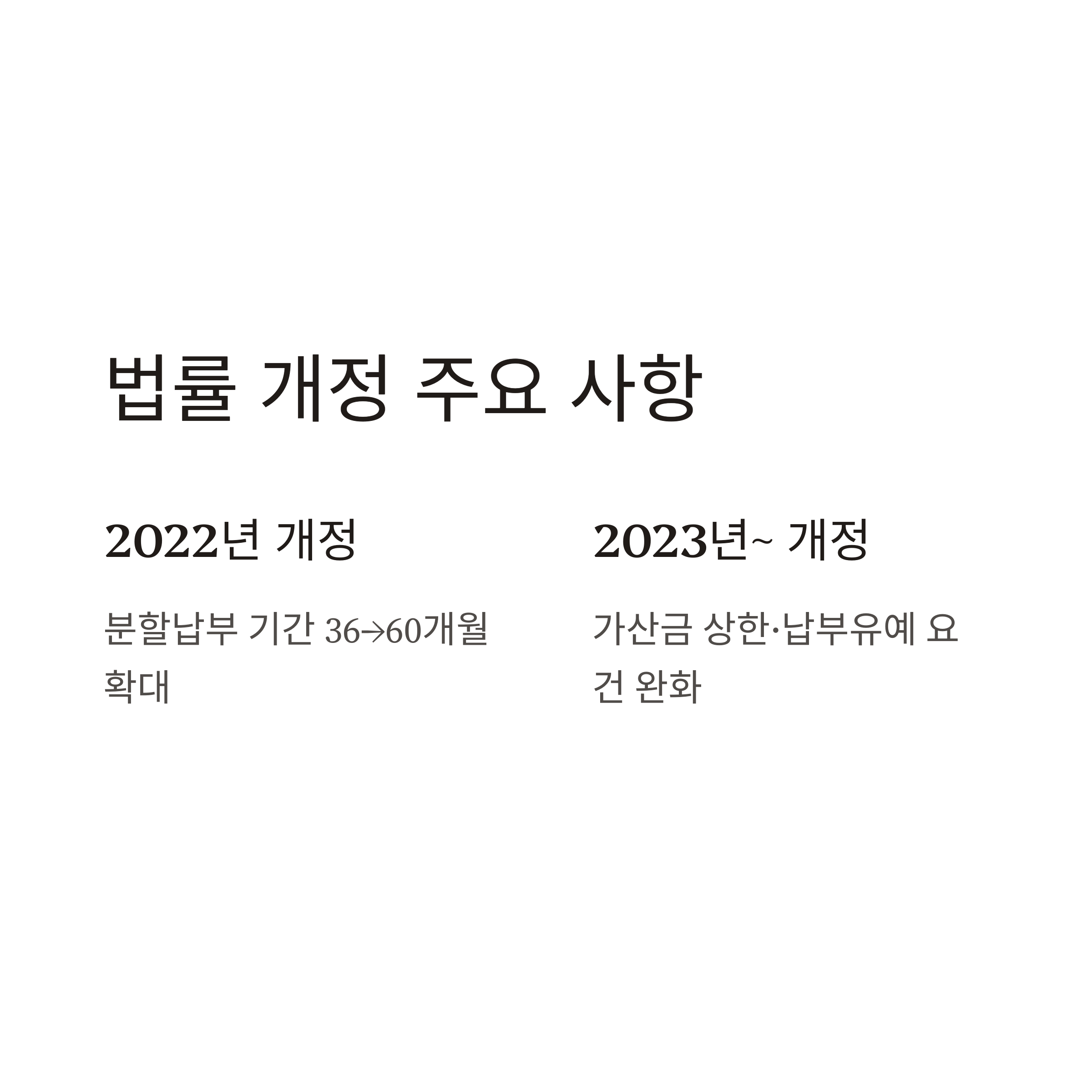 | 2022년 | 분할 납부 기간 36개월 → 60개월 확대 |