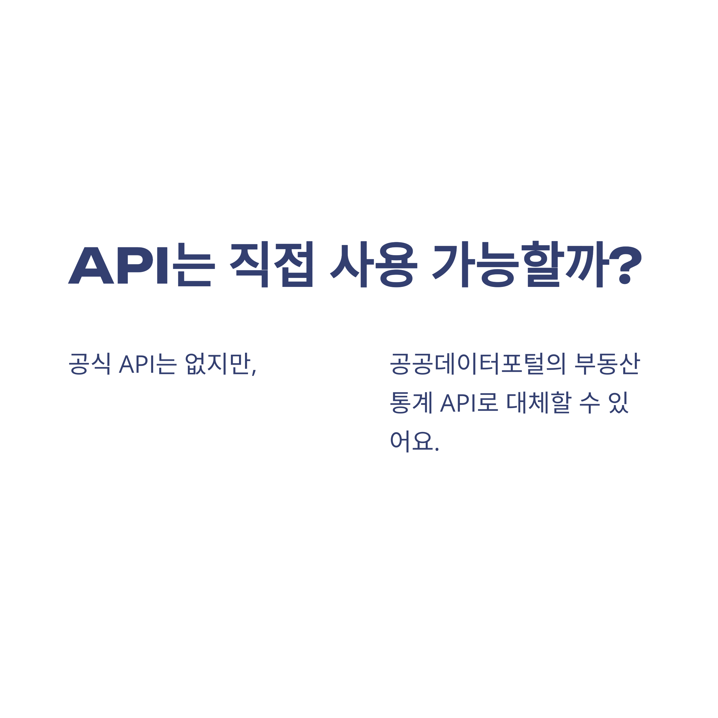 개발자나 부동산 플랫폼 운영자라면 API 활용이 매우 유용할 수 있습니다. KB부동산은 별도 API 제공을 하진 않지만, 부동산 통계 데이터를 제공하는 공공 API를 연동해 대체할 수 있어요.