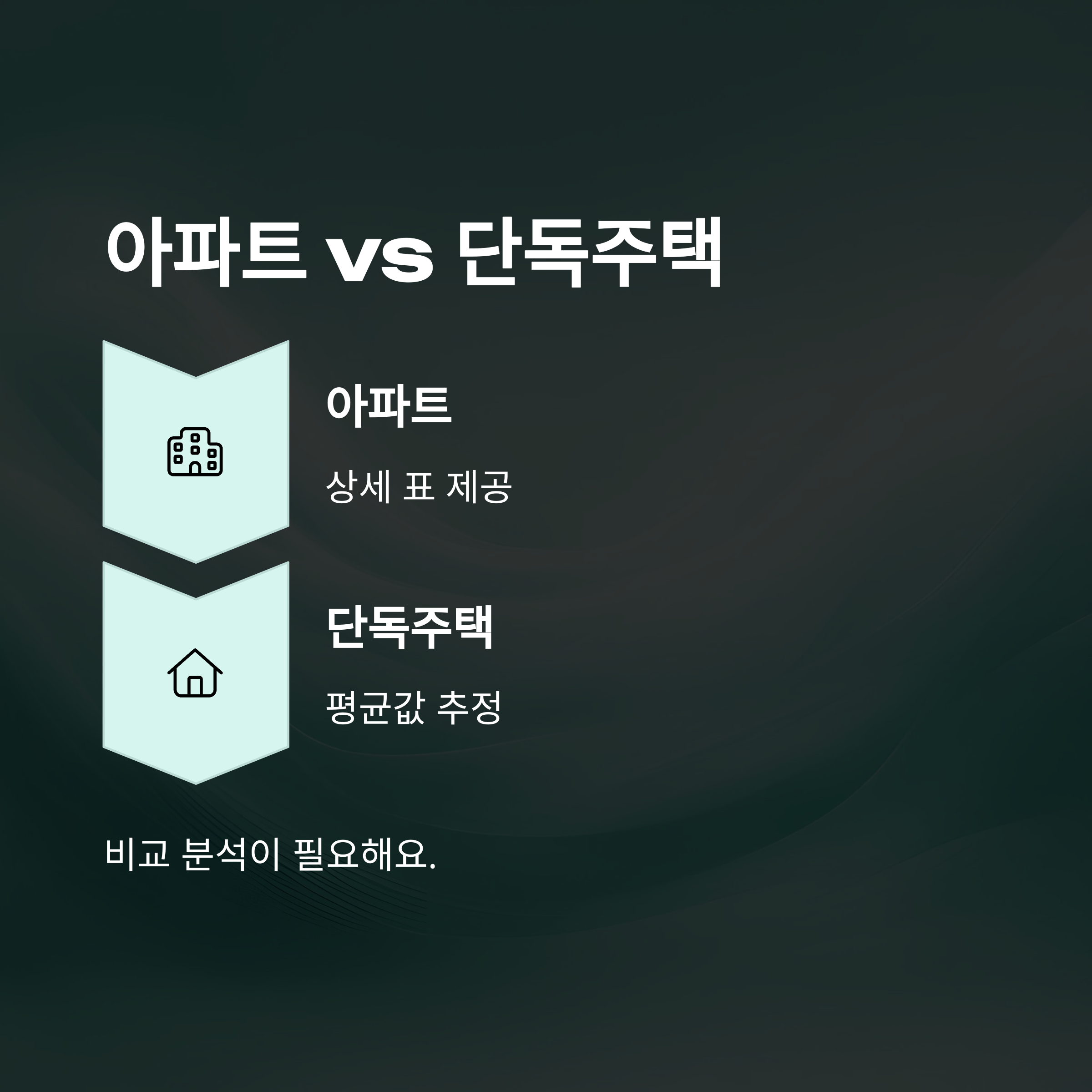 저는 예전에 단독주택을 보고 있었는데, 시세 확인이 생각보다 어려웠습니다. 아파트는 잘 정리된 표로 나오는 반면, 주택은 주변 평균 시세로만 표시되더라고요. 이건 전국적인 거래량 차이 때문입니다.