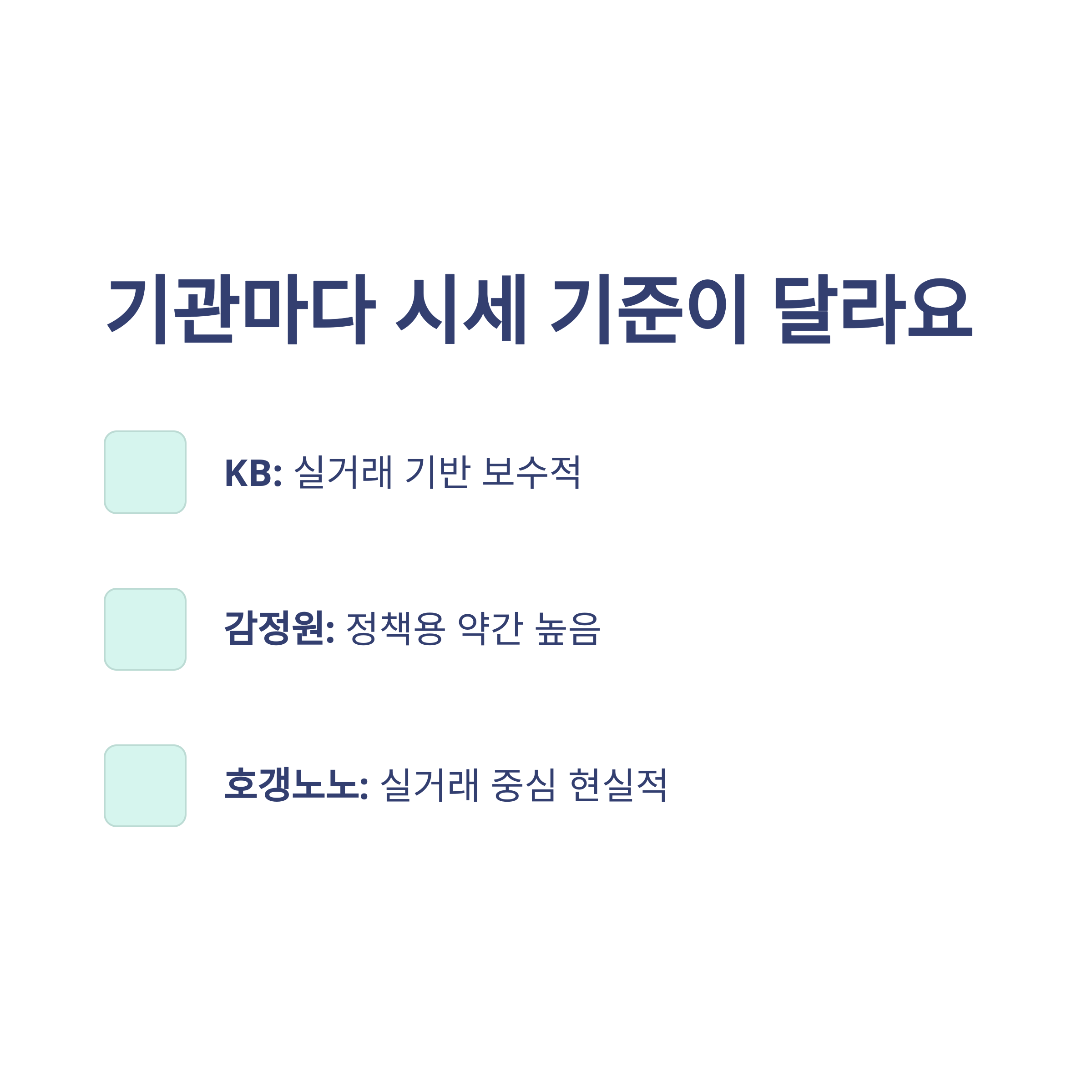 | 한국감정원 | 공공기관 시세조사 | 정책 참고용, 약간 높게 제시 |