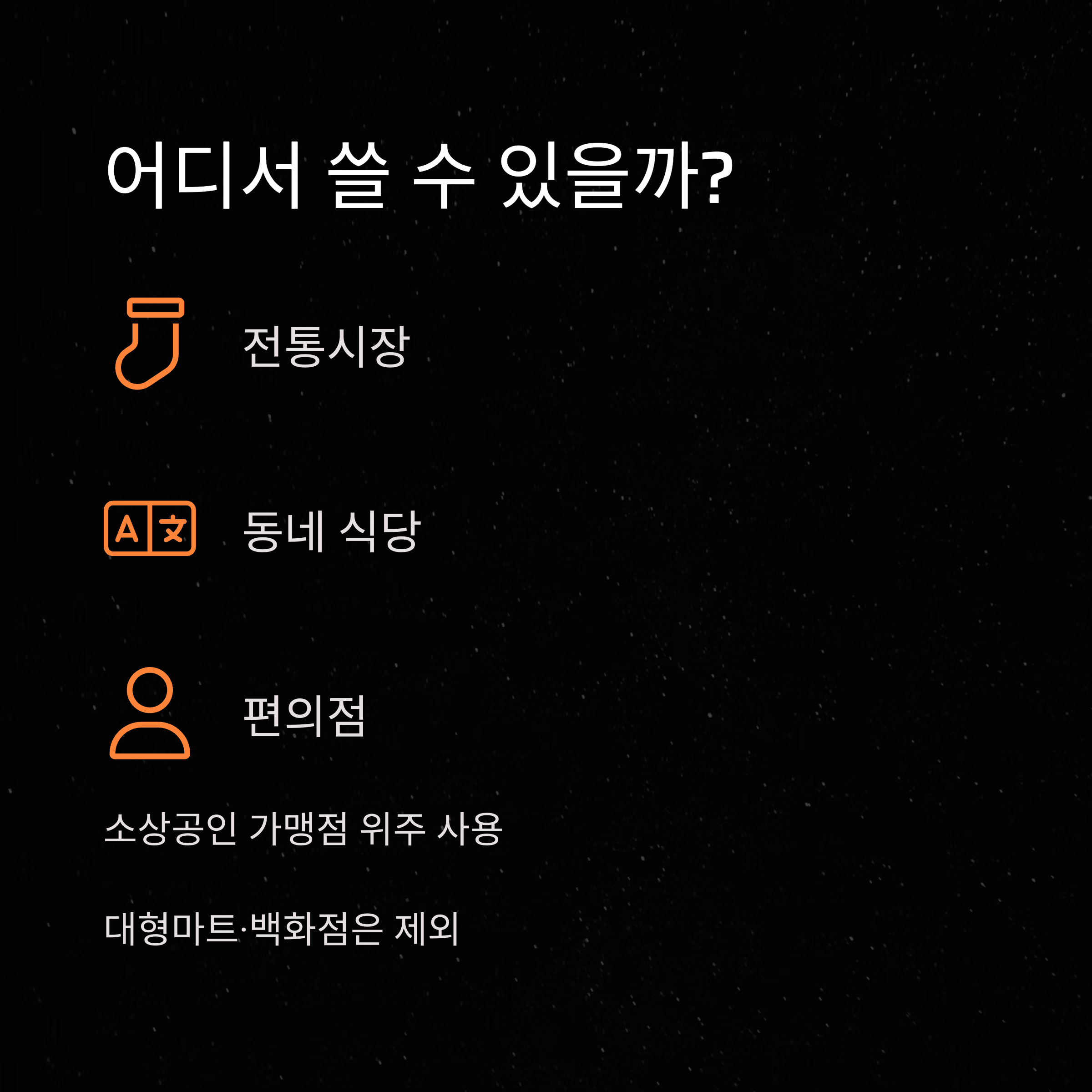 전통시장, 골목상권, 소상공인 가맹점에서 사용 가능합니다.