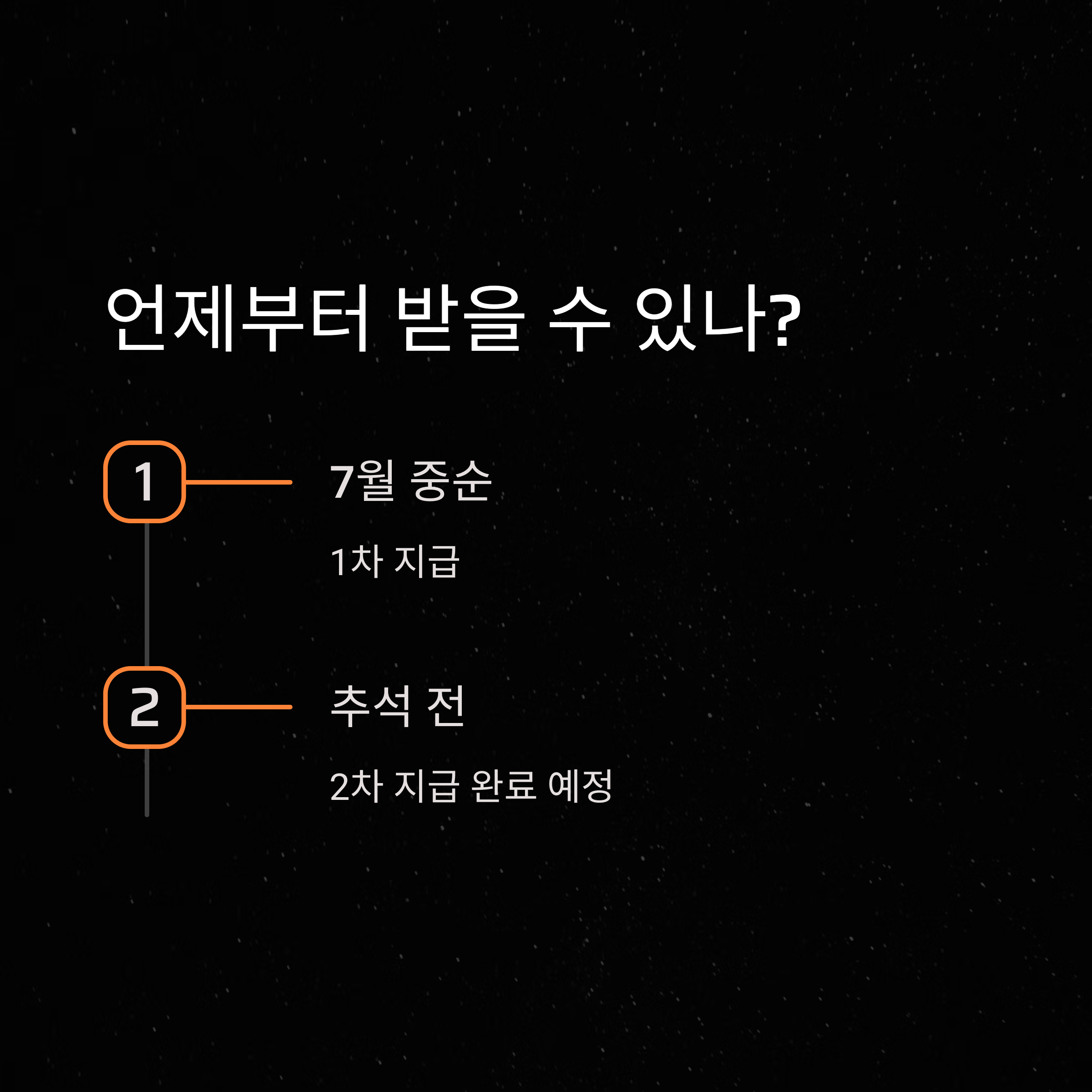 지급 시기는 국회 추경안 통과 후 약 2주 뒤인 7월 중순부터 시작되며, 2차 지급은 추석 이전까지 완료될 예정입니다.