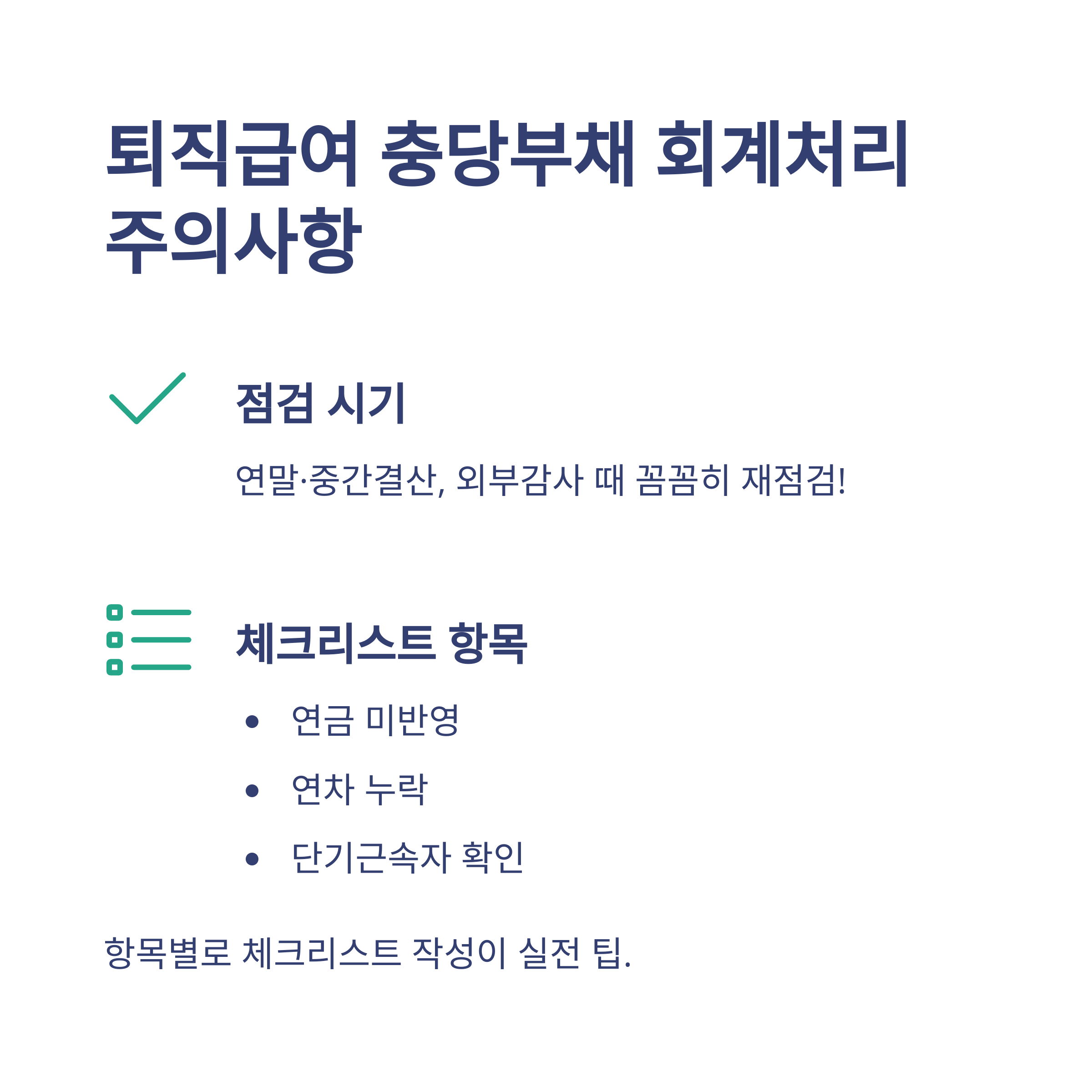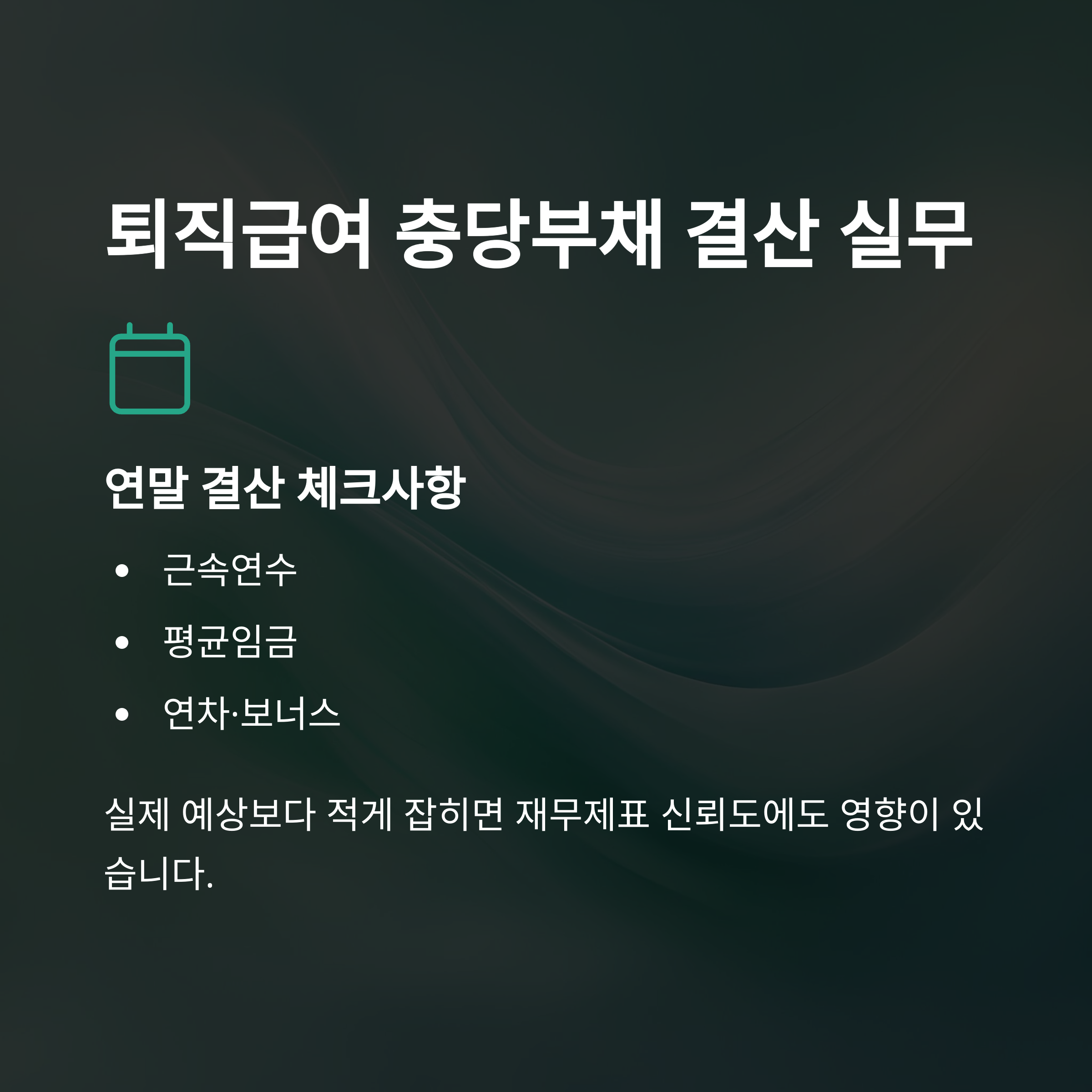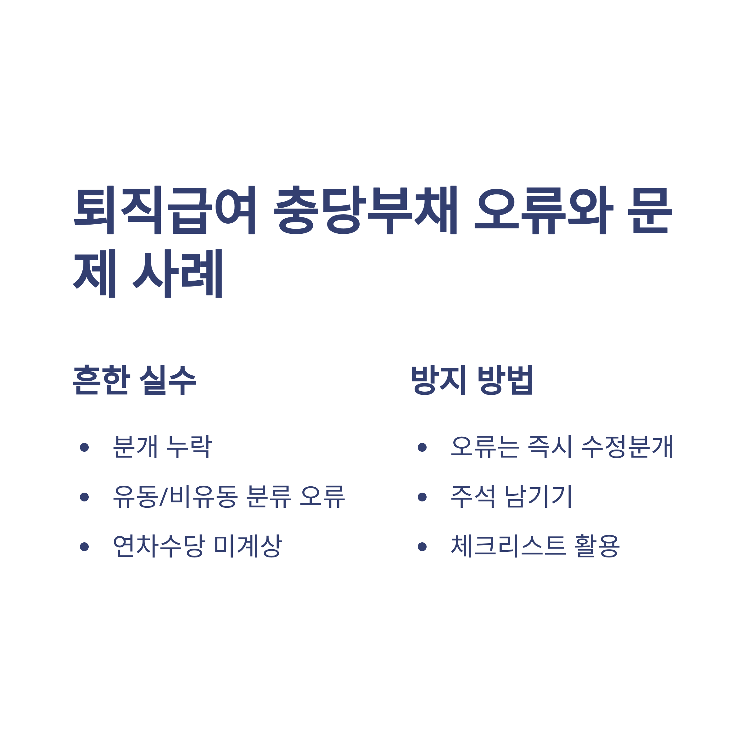 - 실제 현장에서는 퇴직급여 충당부채와 관련된 분개, 계상, 부채 분류 오류가 종종 발생합니다.