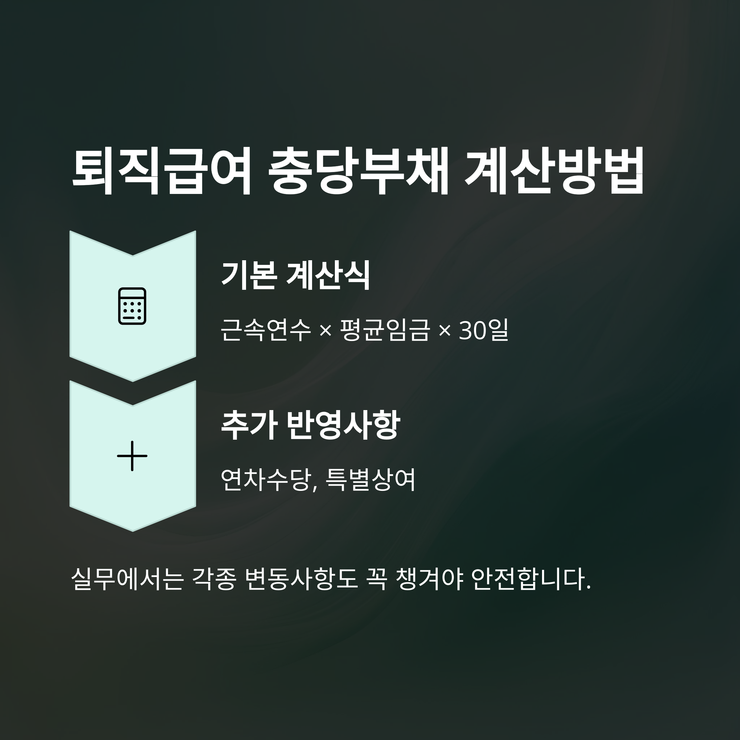 - 실제 계산은 근속연수 × 평균임금 × 30일로 간단히 산출되지만, 실무에서는 퇴직연금 가입, 변동 급여, 특별상여 등이 모두 반영됩니다.
