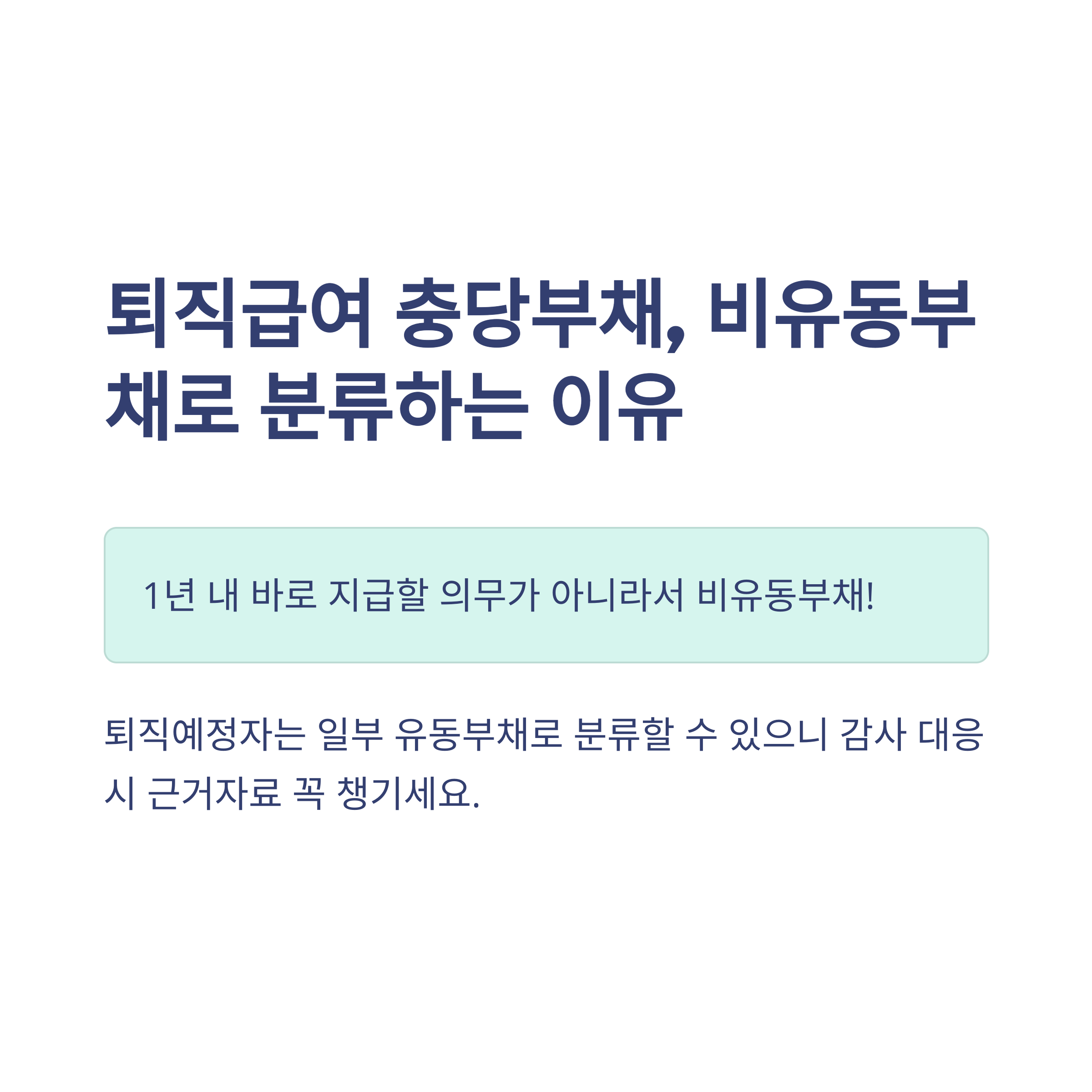 - 퇴직급여 충당부채는 ‘비유동부채’로 분류됩니다. 이건 회사가 1년 내 당장 지급하는 부채가 아니라, 장기적 지급의무이기 때문입니다.