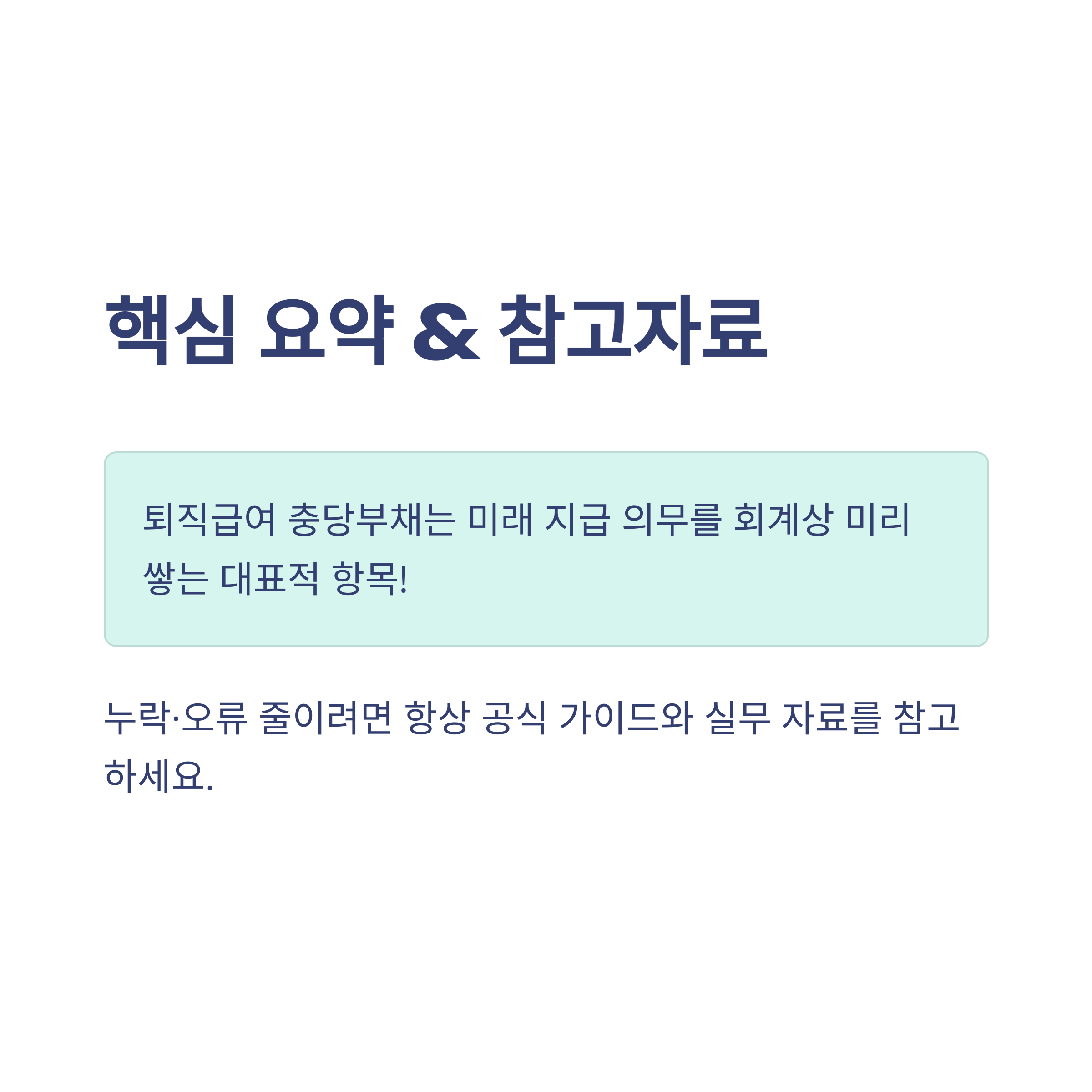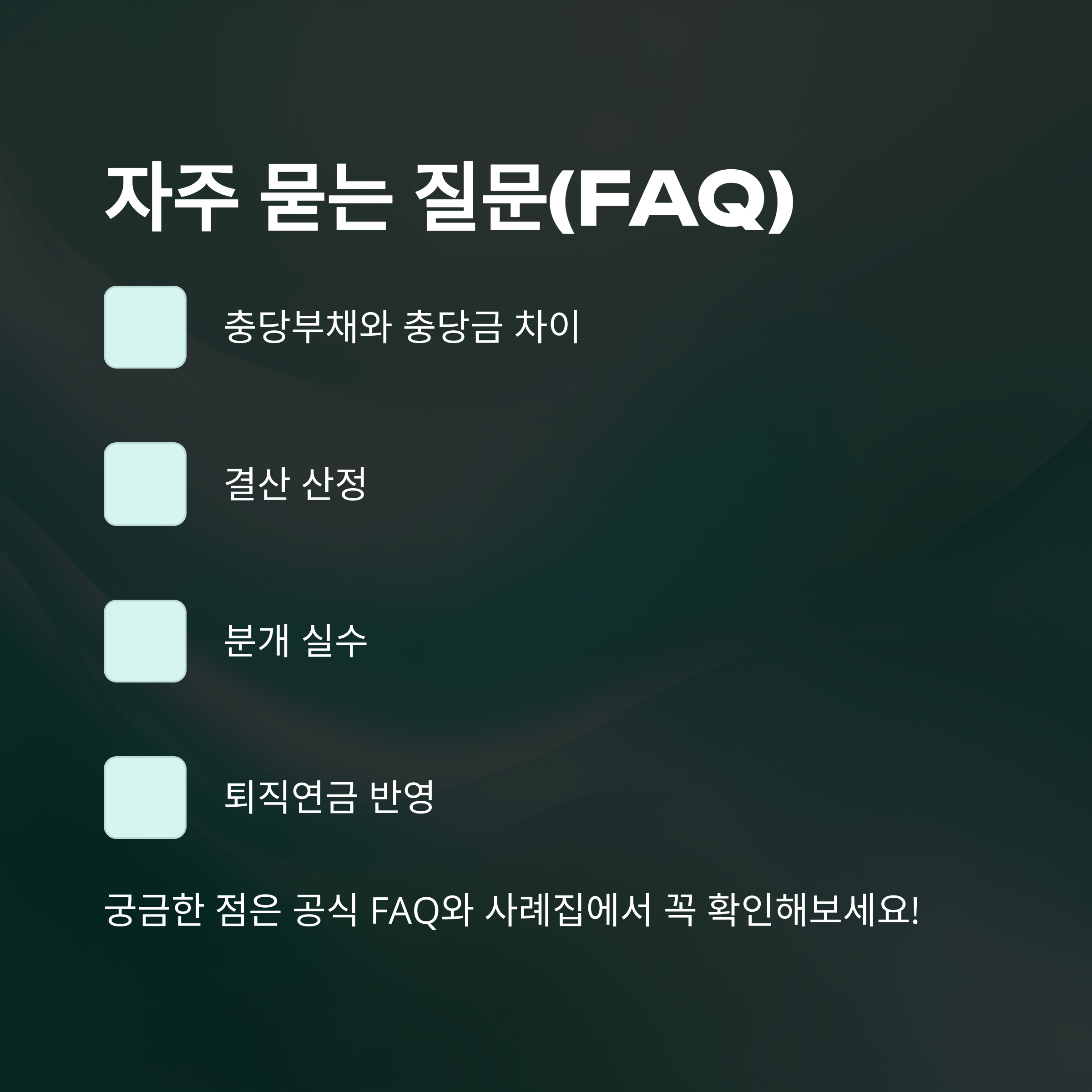 저 역시 퇴직급여 충당부채는 매년 가장 신경 쓰는 결산 항목입니다. 여러 번의 실무 경험을 통해 자료 누락과 오류를 반복적으로 점검하게 되었고, 외부 자료와 최신 회계 FAQ 확인도 놓치지 않습니다.